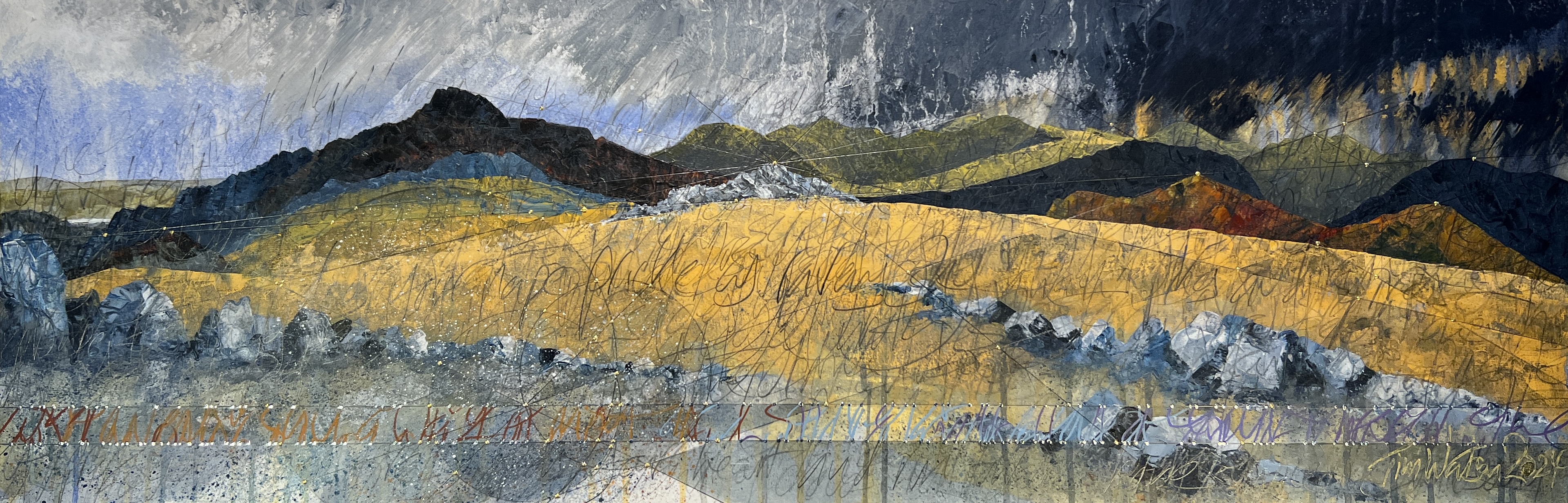 About the Artist Tim works across a range of media, including acrylic, watercolour, inks and plaster collage. His mountain landscape work is well known and collected throughout North Wales. In 2019 he returned to live in Cumbria with his partner Cathryn to focus once more on his art at Brightside Barn in the beautiful Eden Valley. His latest landscape work is now becoming sought after locally, particularly those featuring Blencathra, the Lake District, Askham Fell, the Pennines and prehistoric megalithic sites.